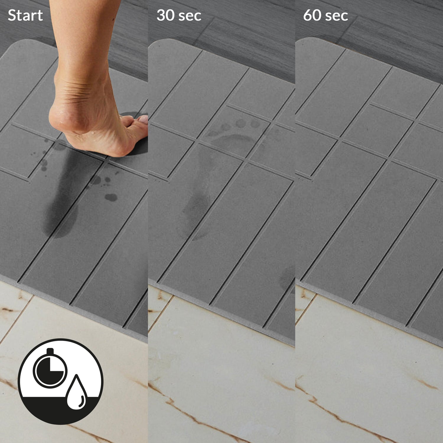 Wystarczy minuta, aby diatomitowa mata w całości zaabsorbowała wodę. Nie musisz już martwić się wycieraniem podłogi po każdej kąpieli ani suszeniem przemoczonego dywanika łazienkowego, który gromadzi