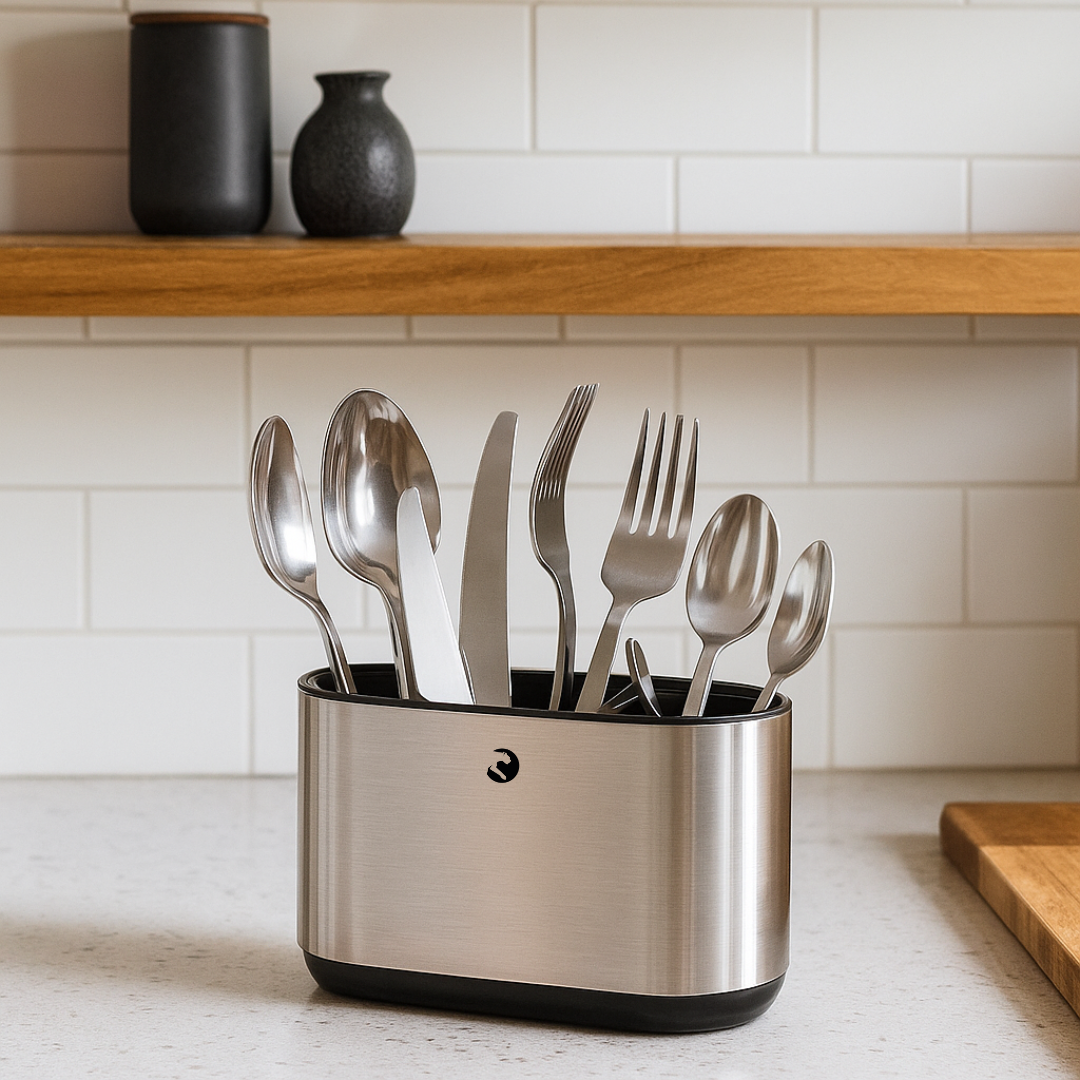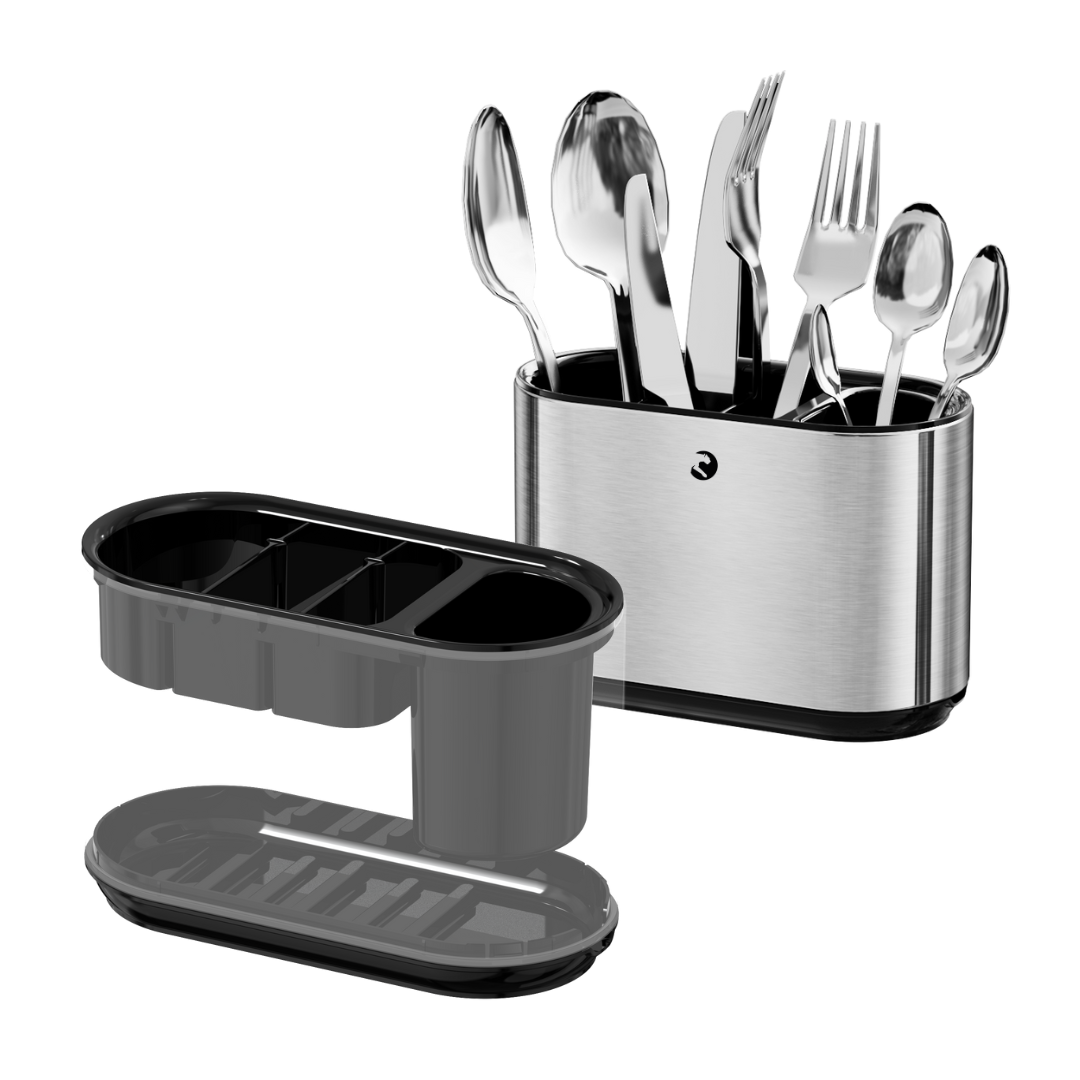 Nasz ociekacz DRAYN został zaprojektowany z myślą o maksymalnej organizacji. Osobne sekcje na noże, widelce, łyżki oraz małe sztućce, takie jak łyżeczki czy widelczyki do deserów, sprawiają, że sztućce nie mieszają się ze sobą. Dzięki temu codzienne wyjmowanie naczyń staje się szybkie i wygodne, a Twój blat pozostaje uporządkowany i schludny.